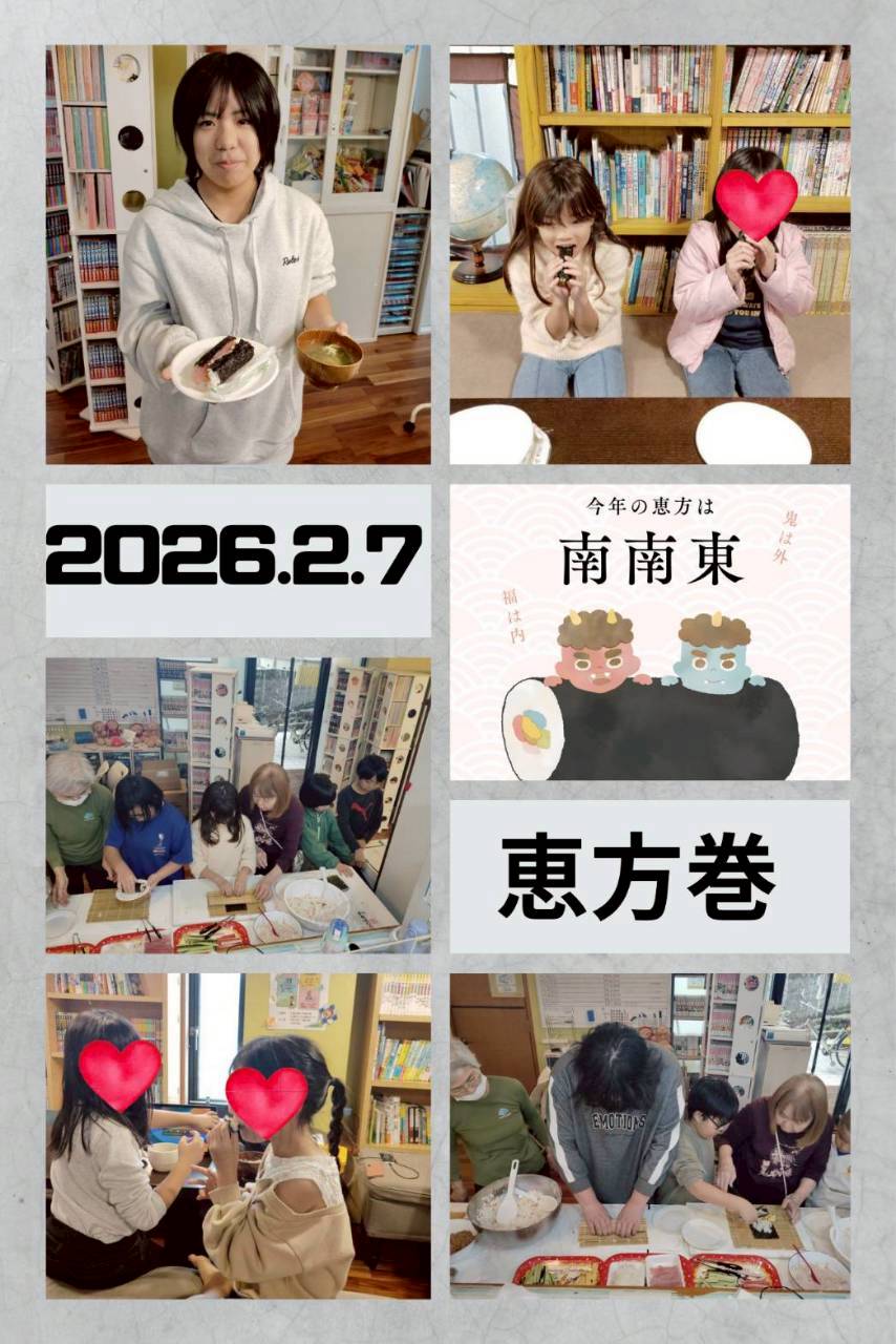 恵方巻、今年は…南南東!2月7日土曜日のランチは、好きな具を選んでくるくる巻いて…みんなでもぐもぐ。今年も健康で、楽しい一年が過ごせますように―