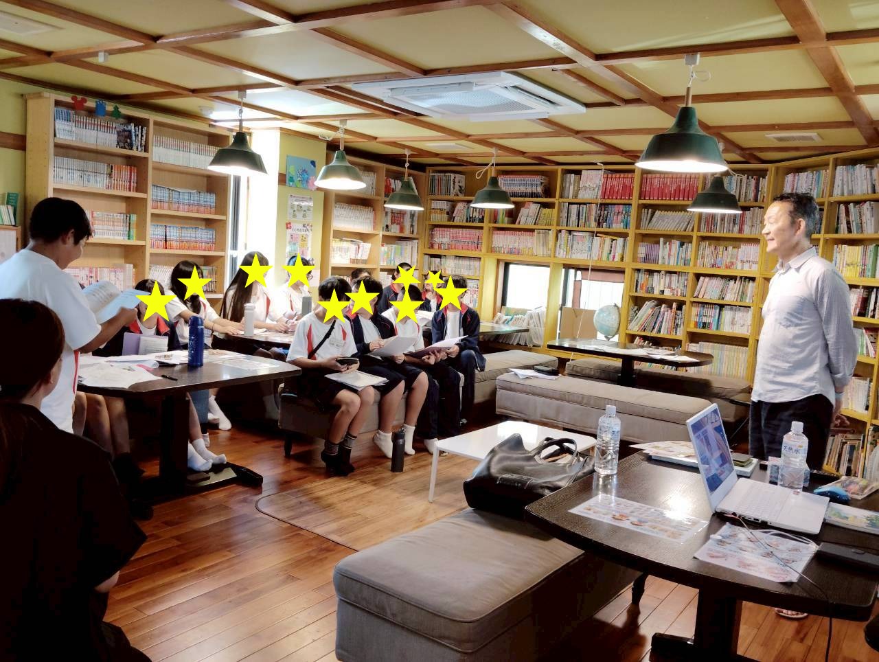 9月17日、那覇市立真和志中学校1年生による地域学習がにじの森文庫にて行なわれました。まず、にじの森文庫を運営する「NPO法人にじのはしファンド」代表の安川から、にじの森文庫の活動について説明をしました。その後、生徒さんから、この仕事に就いたきっかけ、嬉しく思うとき、運営について、にじの森文庫の方針など、たくさんの質問が寄せられました。