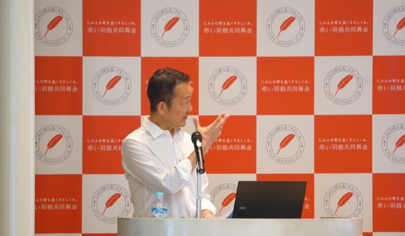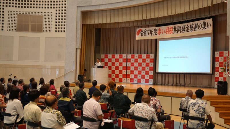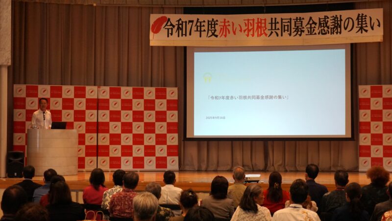 9月18日、令和7年度赤い羽根募金感謝の集い」が沖縄県総合福祉センター東棟ゆいほーるにて行われました。にじの森文庫が助成金受領団体の代表に選ばれ、にじの森文庫を運営するNPO法人にじのはしファンド代表の安川が活動報告を行いました。