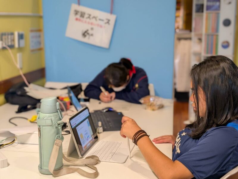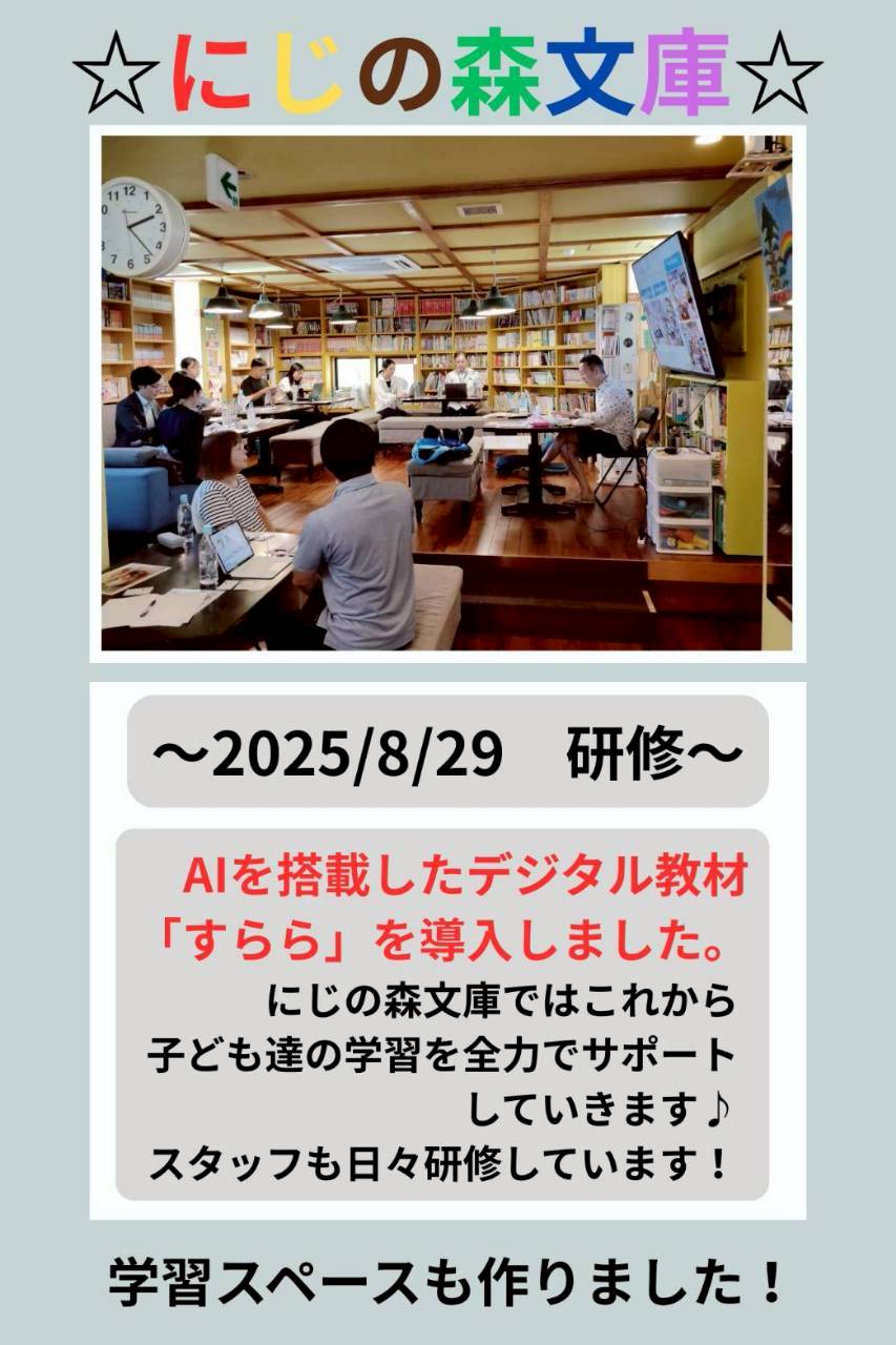 にじの森文庫では、今年6月にデジタル教材「すらら」を導入し、子どもたちのレベルに合わせて学習をサポートしています。「すらら」はAIを駆使した教材で、間違えた場所を確認し、ちゃんと学べるように工夫されています。学習スペースも新しく整えて、勉強したい子がいつでも勉強できるようにしています。また、スタッフに対し「すらら」の研修を行って、円滑な運用ができるようにしています。