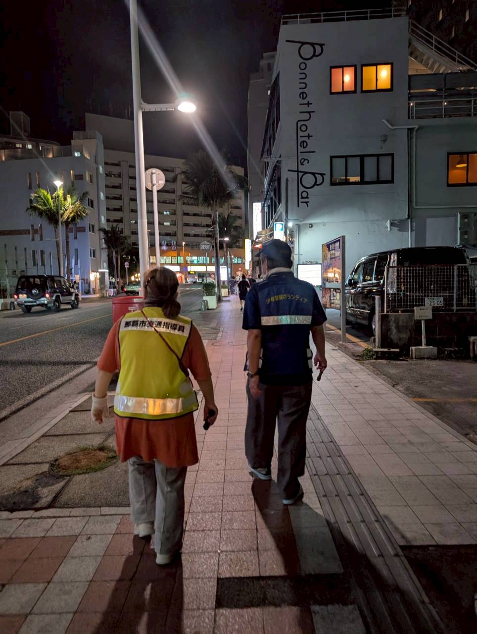 にじの森文庫にやってくる子どもたちの中学校PTAや警察OB、地域の方々が中心となって行っている夜間街頭指導。繁華街や国際通りが近いので、夜は子どもたちにとっては危険が多いのです。子どもたちが危ない目に合わないように、月に一度、にじの森文庫も街頭指導に参加させていただき、情報共有などもしています。今月は10月17日の19時から、館長が参加しました。